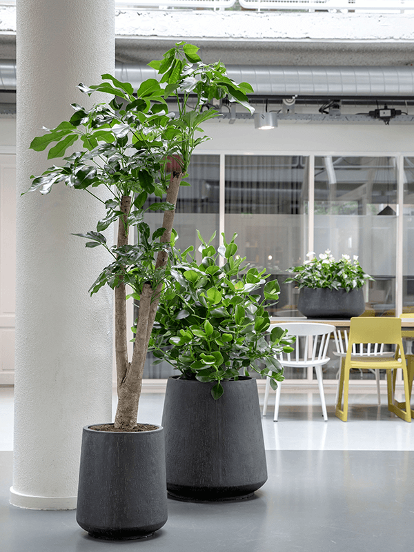 Onze basis opmaak bestaat uit semi hydro, dat betekent dat wij vanaf een potmaat van 20 centimeter en groter, de planten rondom de kwekersaarde afstrooien met hydrokorrels. Hierbij heeft u als extra keuze om een watermeter toe te voegen en of u de bovenkant van de pot wilt laten afstrooien met houtsnippers.
