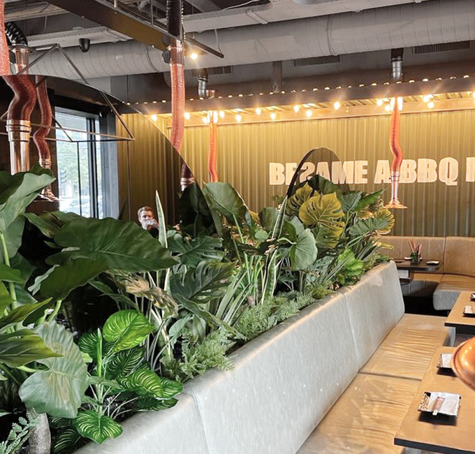 Sztuczne rośliny wzmocniły wygląd i atmosferę restauracji, dopełniając wrażenia gości.