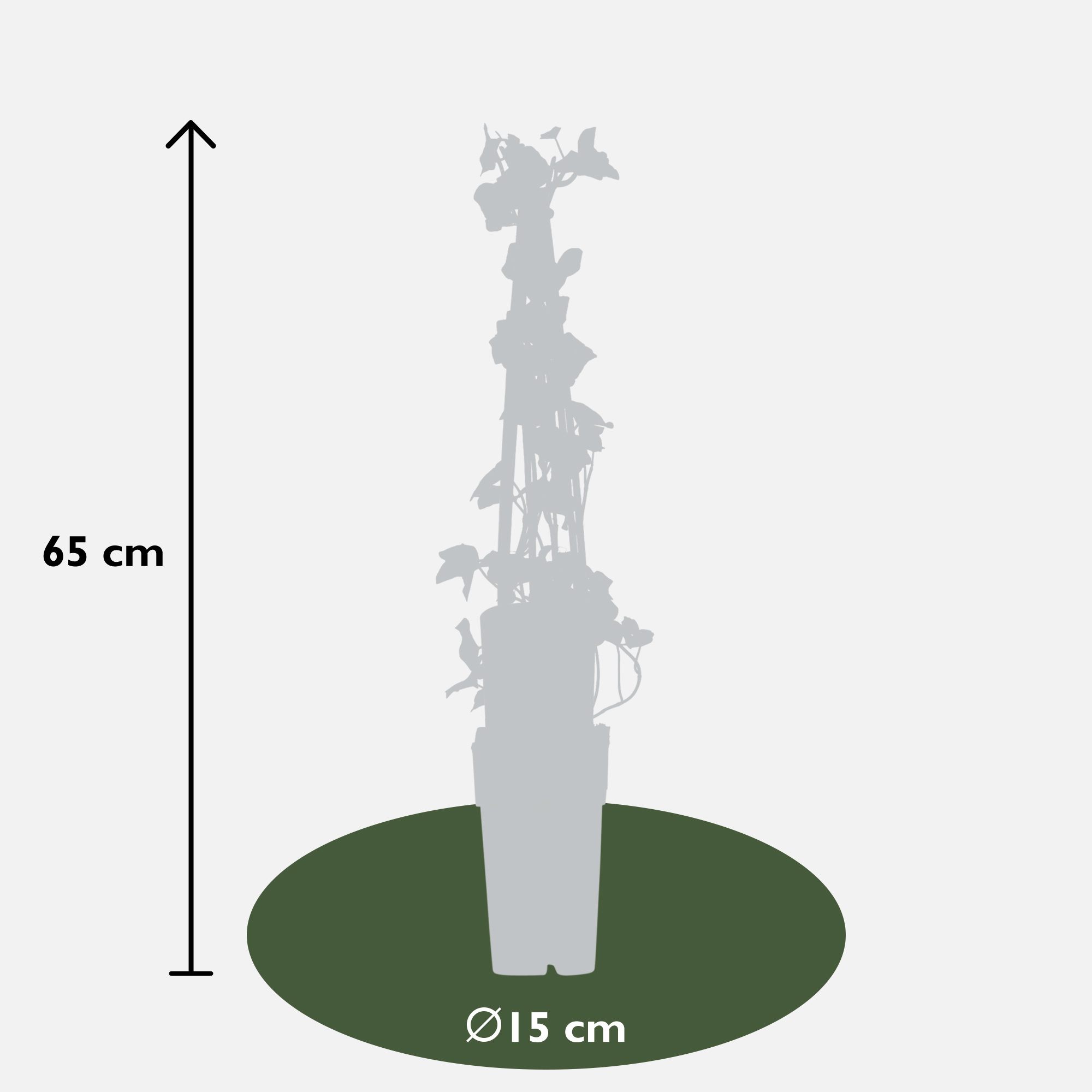 Hedera hibernica jest jednym z najbardziej znanych i najczęściej sadzonych gatunków bluszczu. Powodem tego jest fakt, że roślina ta jest bardzo łatwa w pielęgnacji, szybko rośnie i pozostaje pięknie zielona zimą. Nadaje się zarówno do uprawy w słońcu, jak i w cieniu i rośnie na każdym rodzaju gleby. Dzięki świeżym, zielonym, rozłożystym liściom roślina ta nadaje się do zamaskowania ściany, ożywienia ogrodzenia lub pokrycia siatki ogrodzeniowej. Jeśli nie ma się po czym piąć, łodygi pełzają po ziemi i tworzą korzenie, dzięki którym mogą pokonywać duże odległości. Dzięki temu bluszcz nadaje się również jako roślina okrywowa. Kiedy roślina osiągnie odpowiednią wysokość, można od razu przystąpić do przycinania. Przycinając „Hedera hibernica”, dają Państwo roślinie sygnał, aby rosła bardziej na szerokość. Powtarzając tę czynność, młoda roślina pnąca szybciej pokryje się liśćmi i szybko stanie się piękna i bujna. Bluszcz można przycinać przez cały rok. Należy uważać, aby bluszcz nie przyczepił się do drewnianych elementów domu, ponieważ pozostawia to nieestetyczne ślady po usunięciu pnącza.