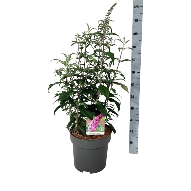Buddleja „Pink Delight” to piękny, obficie kwitnący krzew motylkowy, który nadaje każdemu ogrodowi delikatny, romantyczny wygląd. Dzięki wysokości około 120 cm i dużej doniczce o średnicy 32 cm jest to dobrze rozwinięty okaz, który od razu dodaje objętości i koloru. Odmiana ta znana jest z długich, jasnoróżowych kwiatostanów, które pięknie pachną i przyciągają motyle, pszczoły i inne owady zapylające.
