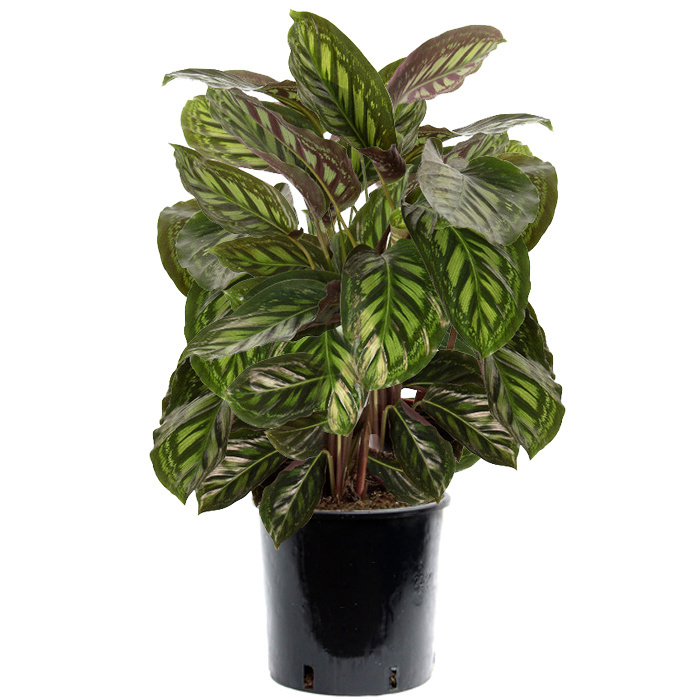 Calathea znana jest ze swoich wyjątkowych, pasiastych i kolorowych liści. Piękne wzory na liściach nadają jej wyjątkowy i efektowny wygląd. Jeśli lubią Państwo mieć w domu coś wyjątkowego, Calathea będzie dobrym wyborem. Oprócz tego, że roślina ta pięknie komponuje się z każdym wnętrzem, ma również właściwości oczyszczające powietrze. Nie zdziw się, jeśli pod wieczór roślina przyjmie inną pozycję. Liście zamykają się bowiem pod wieczór.