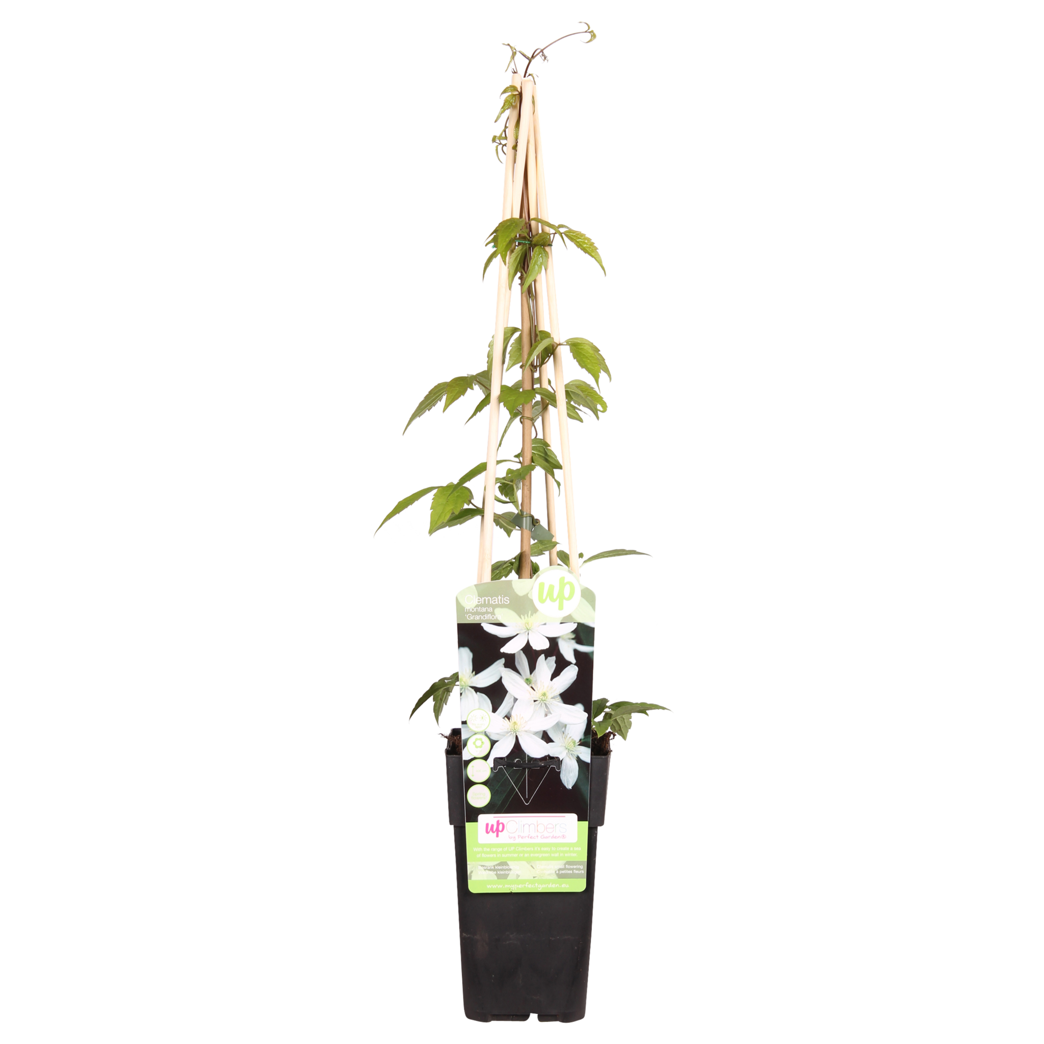 „Clematis Montana Grandiflora” to drobnokwiatowy, ale obficie kwitnący powojnik, który wiosną obsypuje się mnóstwem białych, pachnących kwiatów. Powojnik rośnie szybko i wytwarza więcej i dłuższe pędy niż większość powojników. Roślina pnąca jest idealna do obsadzania pergoli, ale równie dobrze sprawdzi się przy ścianie, płocie czy kratce. Potrzebuje jednak pewnej pomocy przy wspinaniu się, ponieważ nie przyczepia się samodzielnie. Można go prowadzić po drucie lub siatce. Piękną i wyróżniającą cechą jest to, że jego liście zmieniają kolor jesienią. Niskie temperatury nie stanowią problemu dla tej mrozoodpornej rośliny pnącej. Powojnik należy umieścić w pełnym słońcu lub półcieniu. Jeśli powojnik znajduje się w pełnym słońcu, ważne jest, aby korzenie pozostały w cieniu. Można to zrobić, dobrze przykrywając bryłę korzeniową i sadząc ją na głębokość 10 do 15 cm. Po okresie kwitnienia roślinę można przyciąć do 50 cm. Przycinanie utrzymuje roślinę młodą i w formie, ale nie jest konieczne.