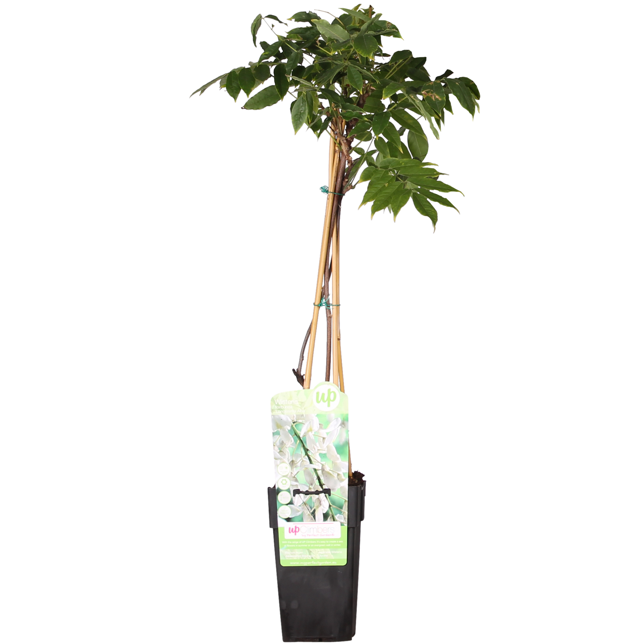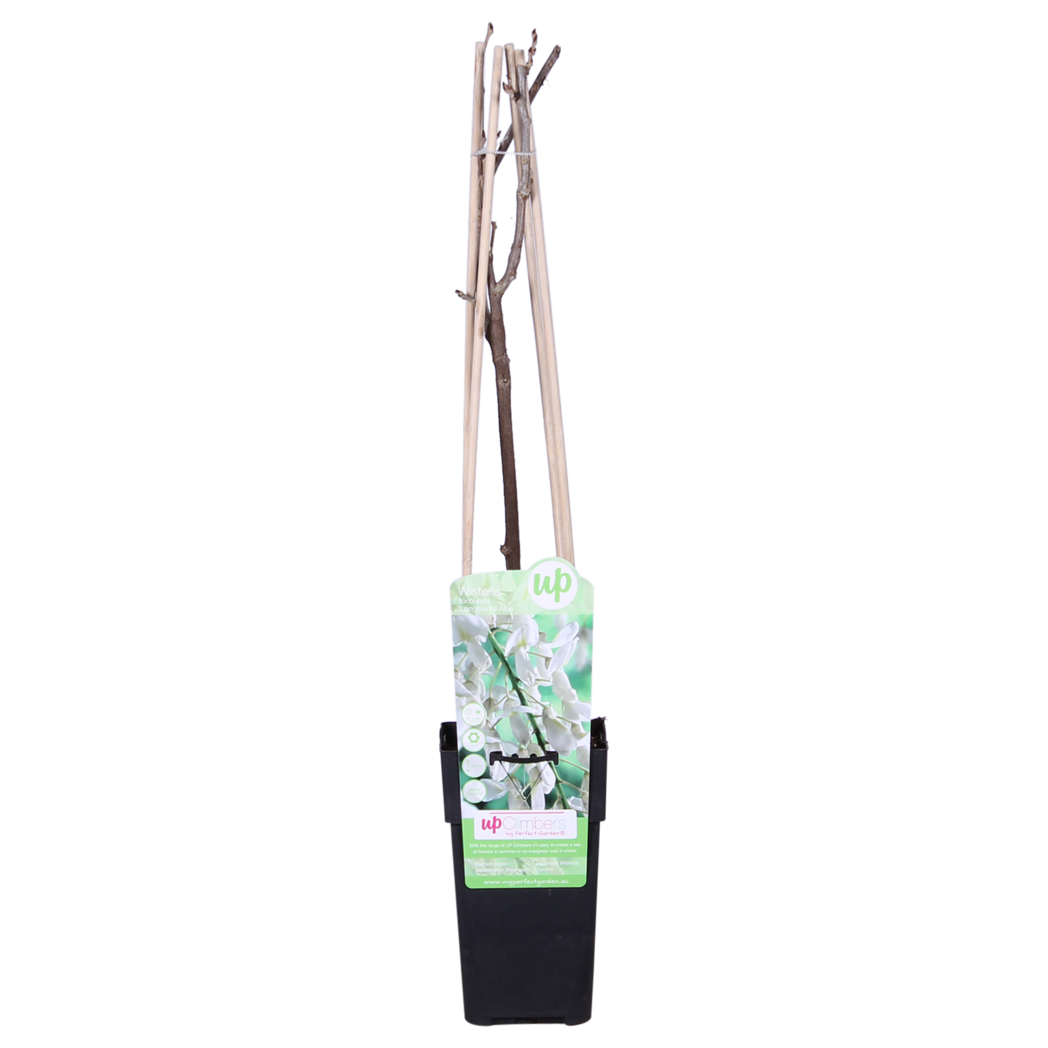„Wisteria floribunda Alba”, znana również jako glicynia biała, to biało kwitnąca odmiana glicynii. Ten gatunek rośnie i kwitnie w ten sam sposób co glicynia, ale jest nieco bardziej ekskluzywny! Jest to roślina pnąca z pięknymi, bardzo długimi, zwisającymi gronami kwiatów, które masowo pojawiają się w maju-czerwcu. We wrześniu może również nastąpić ponowne kwitnienie. Jest to szybko rosnąca roślina pnąca, która może osiągnąć maksymalną wysokość 10 metrów. Aby wisteria zachowała najpiękniejszy kształt, najlepiej prowadzić ją wzdłuż pergoli, płotu lub kraty. Zapewnij solidne wsparcie, do którego zostaną przymocowane gałęzie i po którym będzie mogła wspinać się do słońca. Ponadto ważne jest regularne przycinanie rośliny podczas wzrostu lub wczesną wiosną. Najlepiej przycinać dwa razy w roku.