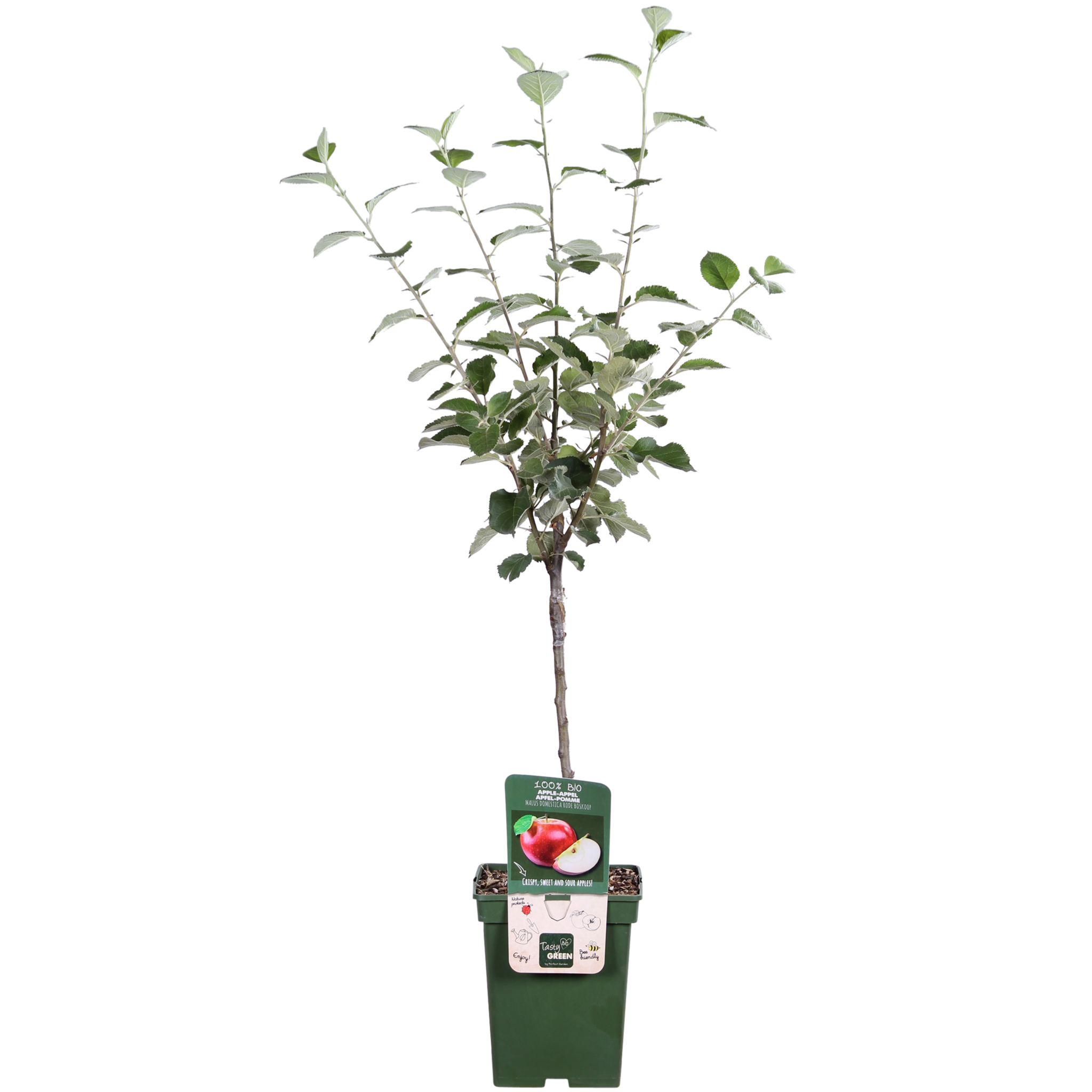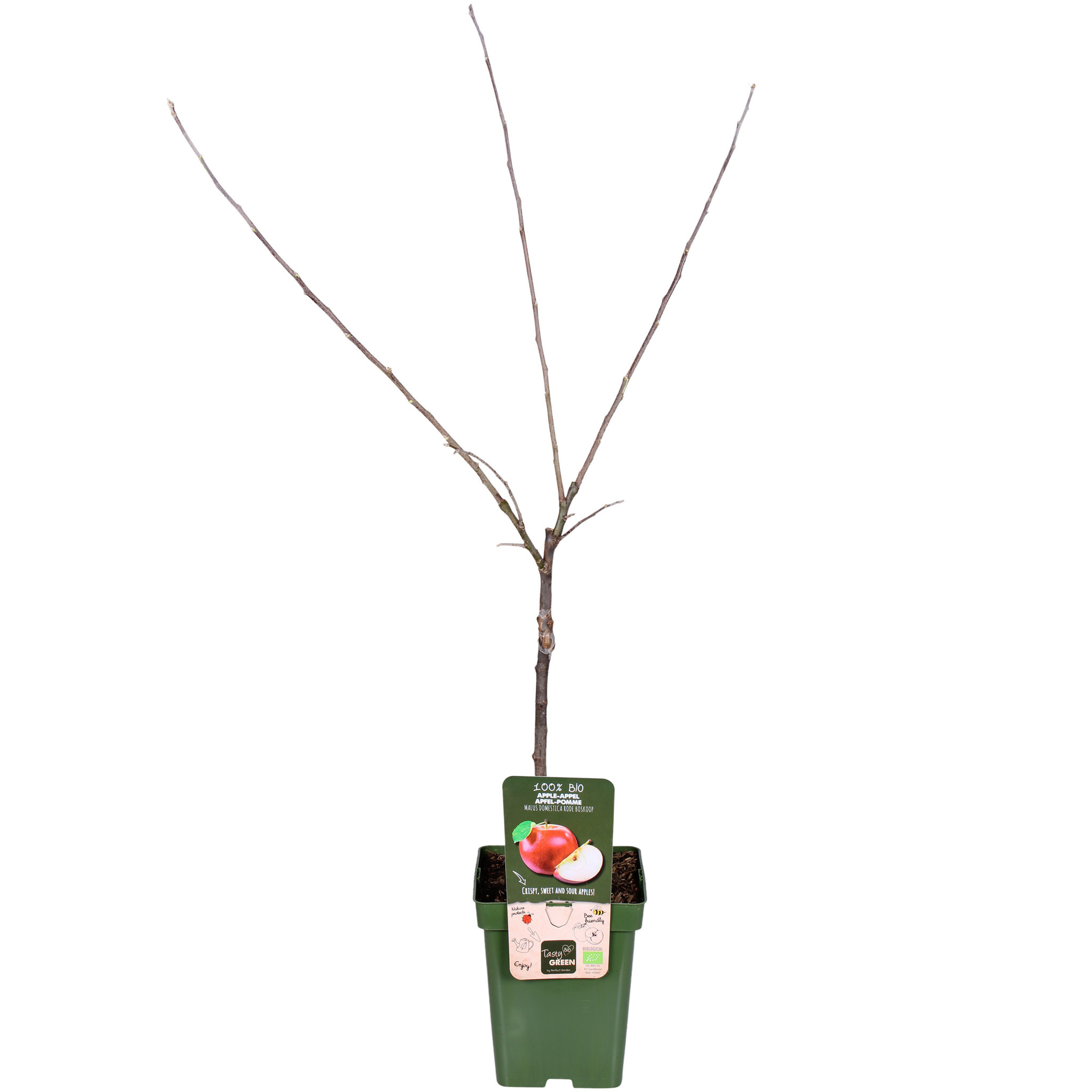 Tasty Green, 100% ekologicznie uprawiane owoce. Oznacza to, że podczas uprawy użyto wyłącznie materiałów roślinnych i zwierzęcych. Doniczka i etykieta wykonane są z przetworzonego plastiku, co stanowi czyste rozwiązanie dla środowiska. „Malus Domestica Rode Boskoop” to jabłoń, która jest również nazywana Goudreinet lub Schone van Boskoop. Jabłko ma matowy kolor i waha się od zielono-żółtego do brązowawego, często z rumieńcem. Jest to dość jędrne jabłko o świeżym, kwaskowatym, lekko słodkim smaku. Ze względu na suchą i nieco szorstką skórkę, jabłko jest mniej popularne jako jabłko deserowe. Ponieważ jabłko zachowuje swoją strukturę i smak podczas gotowania, jest jednym z najlepszych jabłek do szarlotki lub musu jabłkowego.