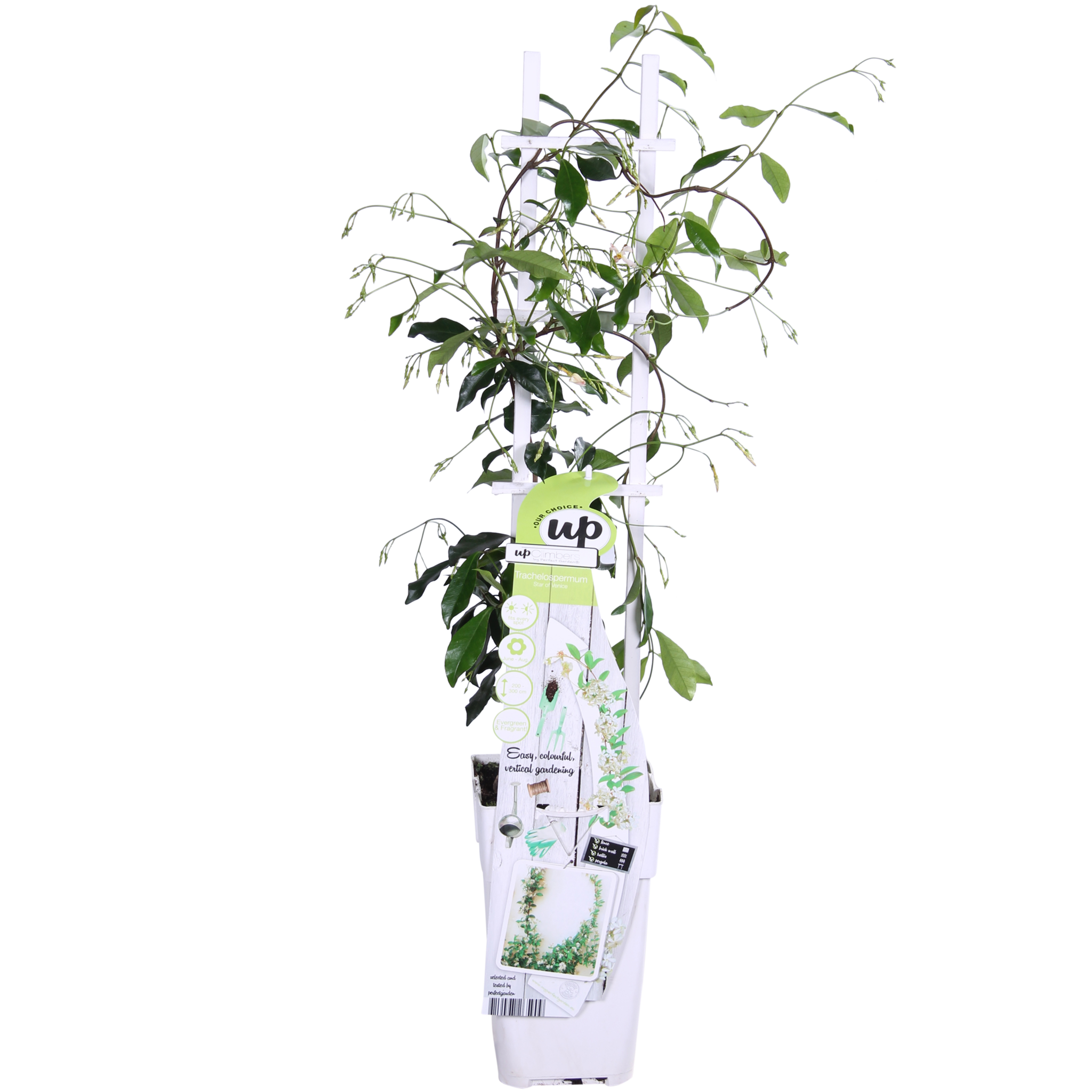 „Trachelospermum Star of Venice”, zwany również jaśminem gwiaździstym ze względu na białe, gwiaździste kwiaty. Jest to śródziemnomorska, zimozielona roślina pnąca, odporna na mróz do -10˚C. Okres obfitego kwitnienia trwa od początku czerwca do końca sierpnia, w tym czasie kwiaty rozprzestrzeniają cudowny słodki zapach. Pnącze ma owalne, ciemnozielone liście i potrzebuje podpory w postaci kratki lub ogrodzenia, aby dobrze rosnąć. Nowe pędy jaśminu gwiaździstego pięknie wiją się wzdłuż siatki lub ogrodzenia. Najlepszym miejscem jest stanowisko słoneczne lub półcieniste, osłonięte od wiatru. Jaśmin gwiaździsty można sadzić w gruncie, w normalnej, żyznej glebie. Dobrze rośnie również w przestronnej donicy na tarasie lub balkonie. W słonecznym miejscu może być również stosowany jako roślina okrywowa. Roślina pnąca dość dobrze znosi okresy suszy, ale podczas upalnych i suchych okresów można ją dodatkowo podlewać. Przycinanie jest konieczne tylko w celu nadania roślinie odpowiedniego kształtu. Najlepiej zrobić to wczesną wiosną lub po okresie kwitnienia. Jaśmin gwiaździsty rośnie dość wolno, więc osiągnięcie maksymalnej wysokości zajmie mu kilka lat.