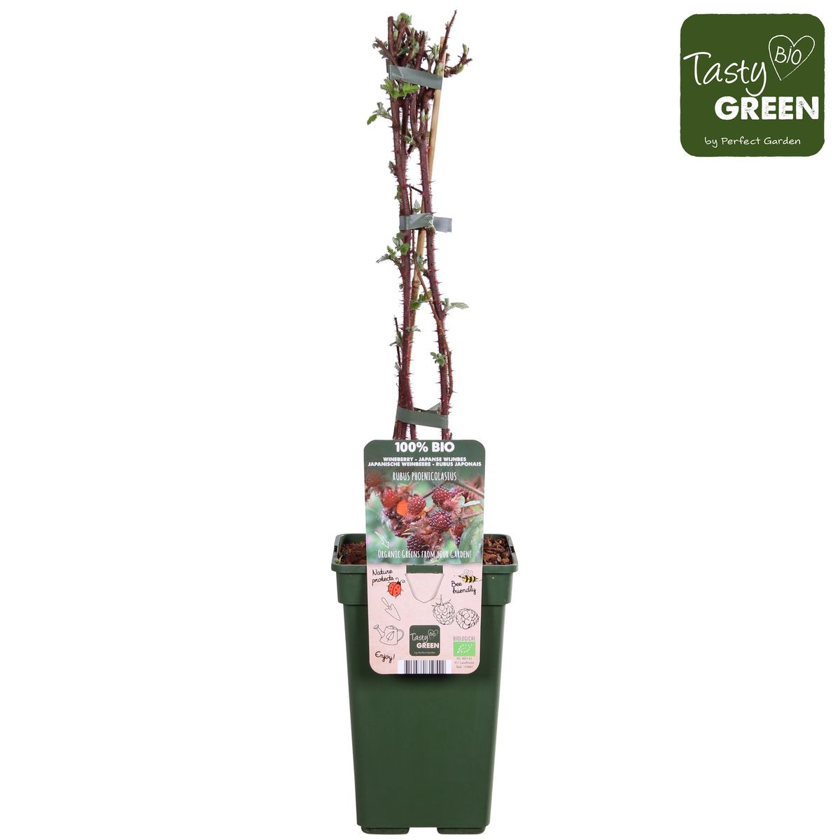 „Rubus Phoenicolasius” to japońska jeżyna winna. Jest to ozdobna roślina pnąca, która dodatkowo ma smaczne owoce. Japońska jeżyna winna pochodzi z Japonii i jest blisko spokrewniona z jeżyną i maliną. Owoce są czerwone i najsmaczniejsze świeżo zerwane. Owoce mają nieco mdły, świeży, słodko-kwaśny smak i są bardzo bogate w witaminy. Są nieco lepkie w dotyku. Im ciemniejszy kolor, tym więcej smaku zyskują. Łodygi japońskiej jeżyny winnej mają sztywne włoski i są czerwone, co nadaje roślinie egzotyczny wygląd. Co roku jagoda kwitnie na drewnie z poprzedniego roku i co roku wytwarza nowe pędy, na których w następnym roku pojawią się owoce. Drewno, które owocowało, można przyciąć zimą, a nowe pędy mogą pozostać na zimę. Japońska jeżyna winna kwitnie co roku w maju i czerwcu. Pszczoły i trzmiele uwielbiają tę roślinę, gdy kwitnie. Zbiory odbywają się w lipcu i sierpniu. Lubi słoneczne stanowisko i najlepiej rośnie w próchnicznej, wilgotnej glebie.