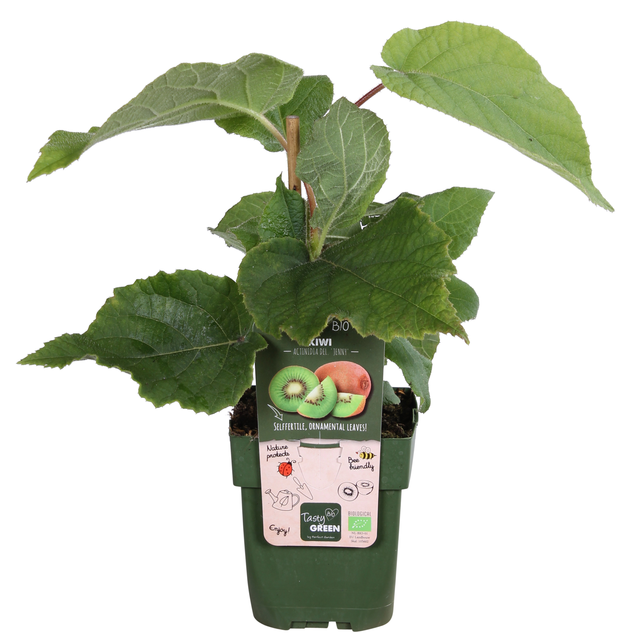 Tasty Green, owoce uprawiane w 100% ekologicznie. Oznacza to, że podczas uprawy wykorzystywane są wyłącznie materiały pochodzenia roślinnego i zwierzęcego. Doniczka i etykieta są wykonane z tworzywa sztucznego pochodzącego z recyklingu, dzięki czemu stanowią rozwiązanie przyjazne dla środowiska. „Actinidia delciosioa Jenny” to łatwa w uprawie i samozapylająca odmiana kiwi. Kiwi pochodzi z Chin. Na początku XX wieku nasiona zostały sprowadzone do Nowej Zelandii. Kiedy kiwi stało się ważnym produktem eksportowym, roślina została nazwana na cześć znanego ptaka, kiwi. Jest to szybko rosnąca, pnąca roślina, którą najlepiej umieścić przy drabince, ogrodzeniu lub pergoli. Kiwi kwitnie w maju i czerwcu białymi i różowymi kwiatami. Pierwsze dojrzałe owoce pojawiają się na początku września. Należy pamiętać, że może minąć kilka lat, zanim roślina zacznie owocować. Zazwyczaj trwa to około trzech do pięciu lat. Owoce mają owłosioną skórkę, owalny kształt i jasnozielony miąższ z białym rdzeniem i pierścieniem czarnych pestek wokół niego. Kiwi jest zdrowe i zawiera dużo witaminy C.