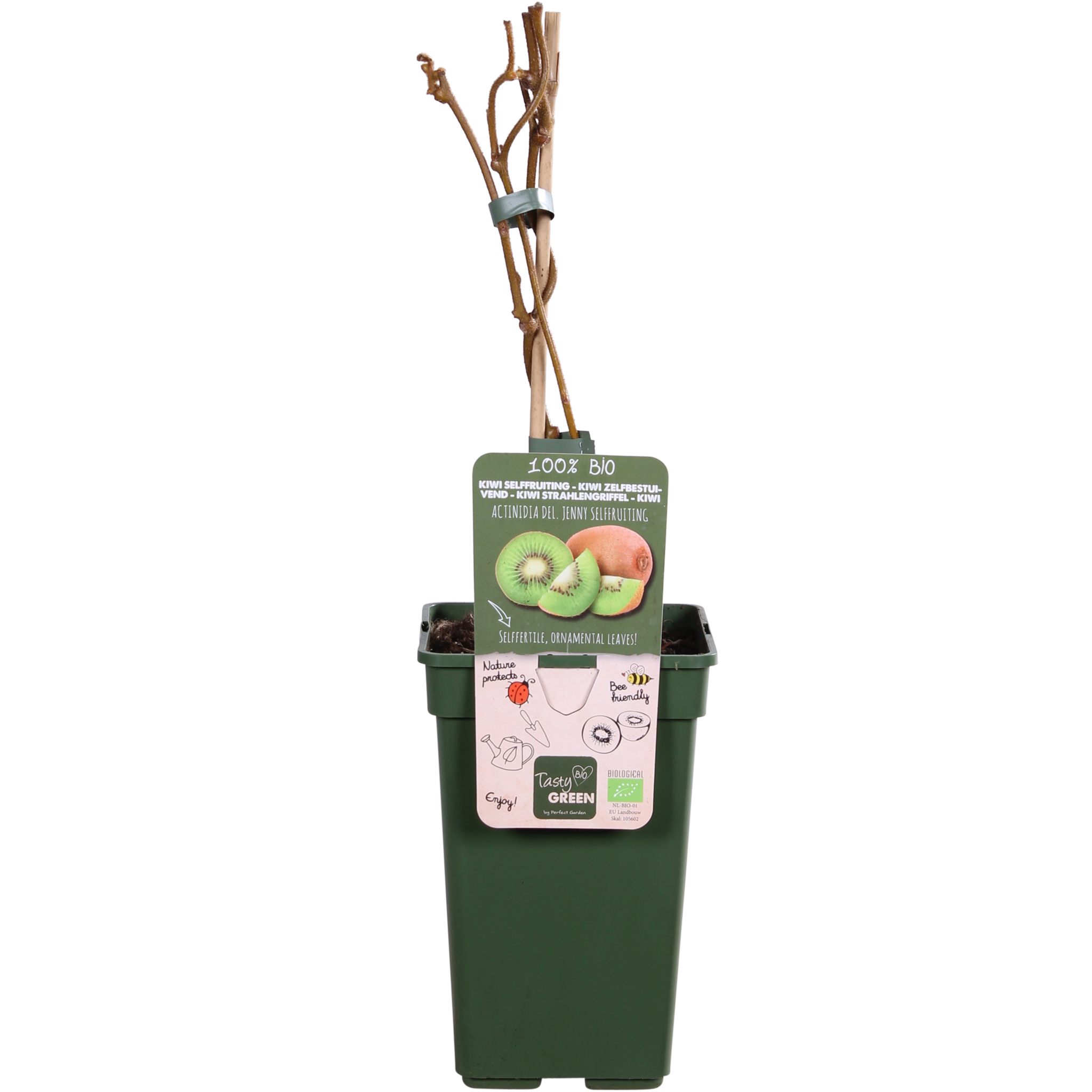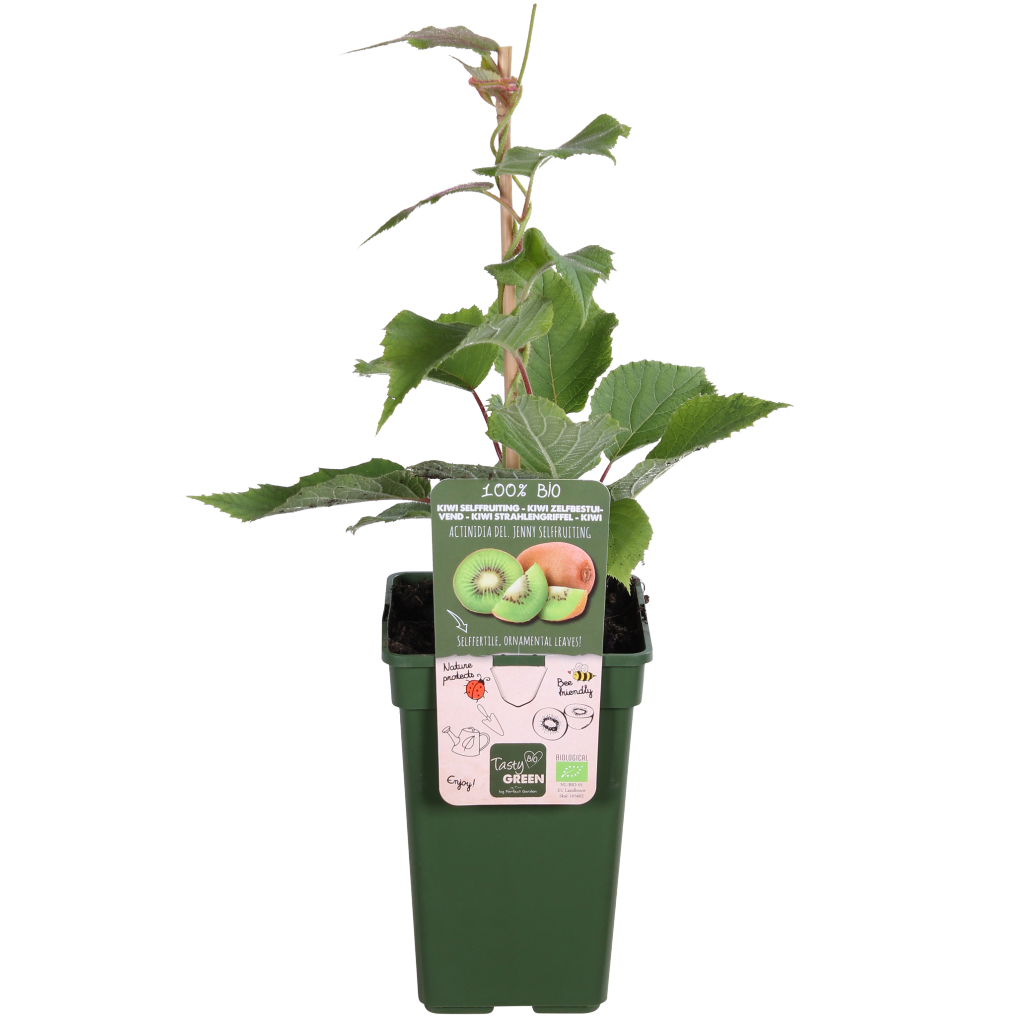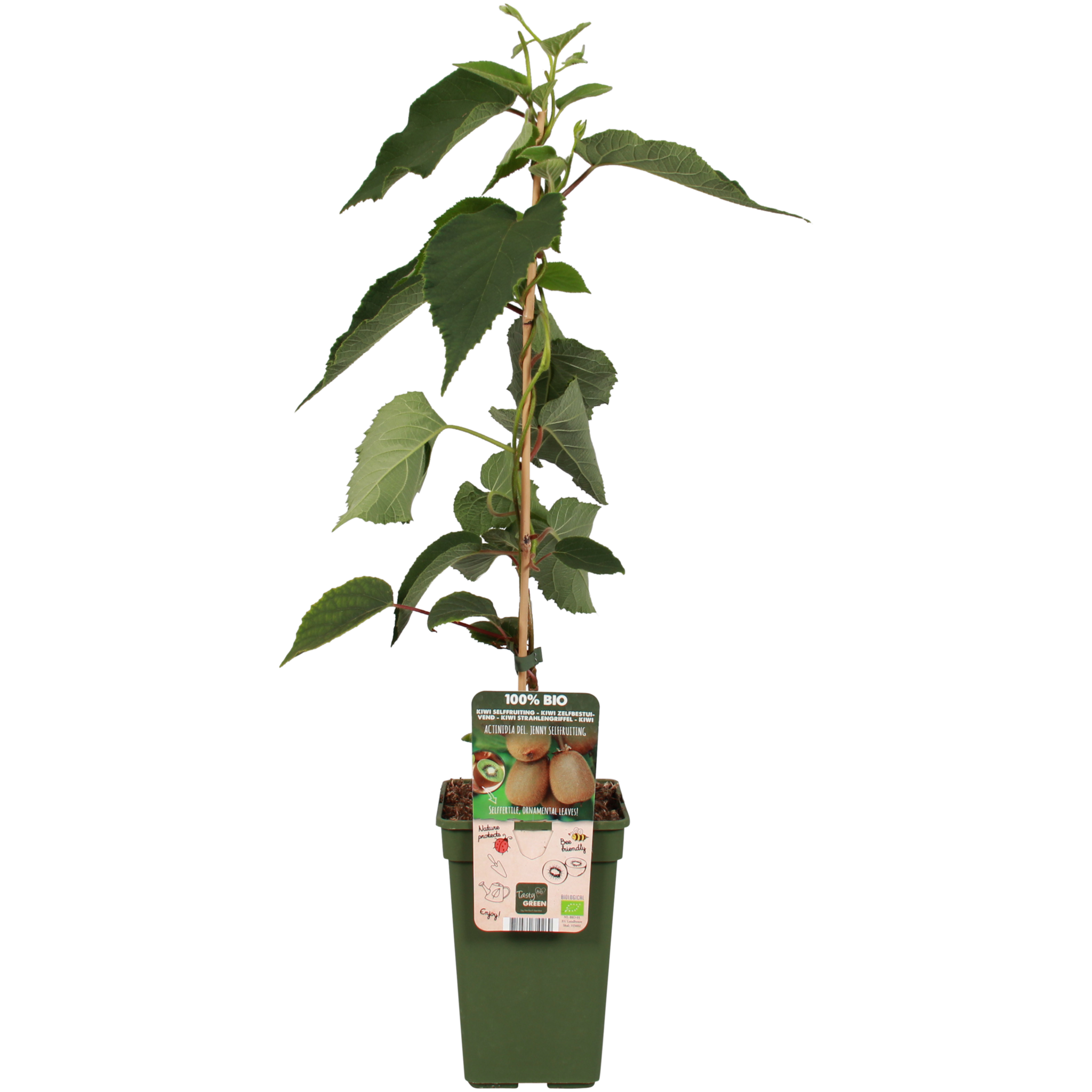 Tasty Green, owoce uprawiane w 100% ekologicznie. Oznacza to, że podczas uprawy wykorzystywane są wyłącznie materiały roślinne i zwierzęce. Doniczka i etykieta wykonane są z plastiku pochodzącego z recyklingu, co stanowi czyste rozwiązanie dla środowiska. „Actinidia deliciosa Jenny” to łatwa w uprawie i samopylna odmiana kiwi. Kiwi pochodzi z Chin. Na początku XX wieku nasiona zostały sprowadzone do Nowej Zelandii. Kiedy kiwi stało się ważnym produktem eksportowym, roślina została nazwana na cześć znanego nielota, ptaka kiwi. Jest to szybko rosnące pnącze i najlepiej umieścić je przy kratce, płocie lub pergoli. Kiwi kwitnie w maju i czerwcu białoróżowymi kwiatami. Na początku września pojawią się pierwsze dojrzałe owoce. Należy pamiętać, że może minąć kilka lat, zanim roślina zacznie owocować. Zazwyczaj trwa to od trzech do pięciu lat. Owoce mają owłosioną skórkę, są owalne i mają jasnozielony miąższ, z białym rdzeniem i pierścieniem czarnych pestek wokół tego rdzenia. Kiwi jest zdrowe i zawiera dużo witaminy C.
