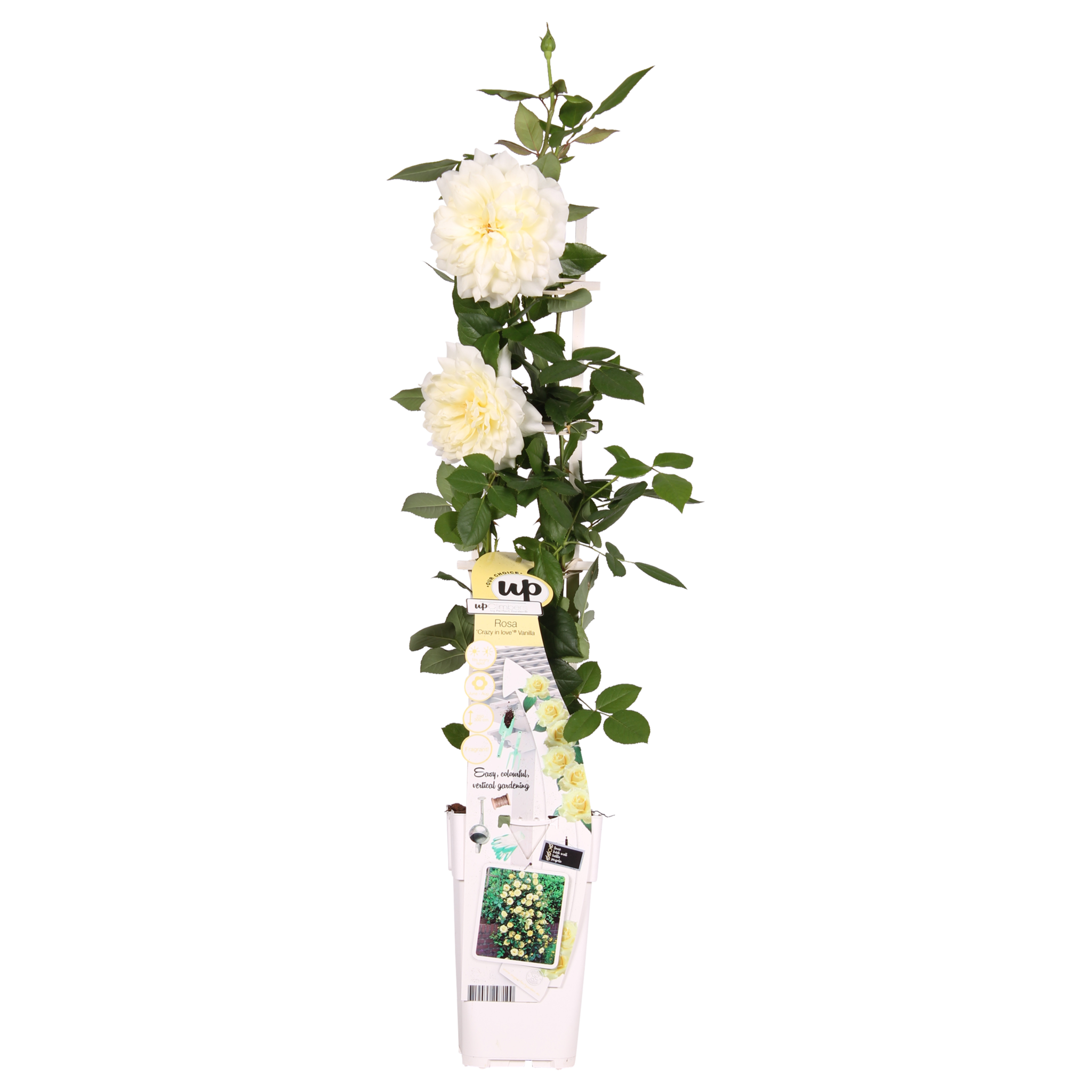 „Rosa Crazy in love Vanilla” to popularna kremowo-biała róża pnąca o świeżo zielonych, błyszczących liściach. Róże od setek lat należą do najbardziej znanych i najczęściej sadzonych roślin. Róża ma symboliczne znaczenie w różnych kulturach. Już w starożytności zdobiły świątynie i pałace. Róża zaczyna kwitnąć w czerwcu i kwitnie do pierwszych przymrozków w październiku lub listopadzie. Aby stymulować kwitnienie, zaleca się usuwanie starych i przekwitłych kwiatów. Róża pnąca lubi słoneczne stanowiska, a aby uzyskać najpiękniejszy wzrost, najlepiej co roku przycinać ją do około 30 centymetrów nad ziemią. W ten sposób zapobiegają Państwo ogołoceniu róży od dołu. Najlepszym okresem na to jest jesień lub wczesna wiosna. Róża potrzebuje pomocy przy pnąciu się. Można to zrobić, prowadząc gałęzie wzdłuż kratki, słupka lub ogrodzenia. Róże są znane z tego, że zużywają dużo składników odżywczych. Aby róża pnąca pozostała zdrowa, zalecamy coroczne nawożenie jej nawozem sztucznym przeznaczonym specjalnie dla róż.