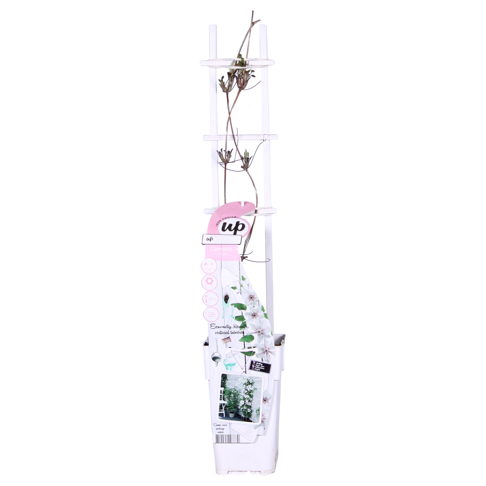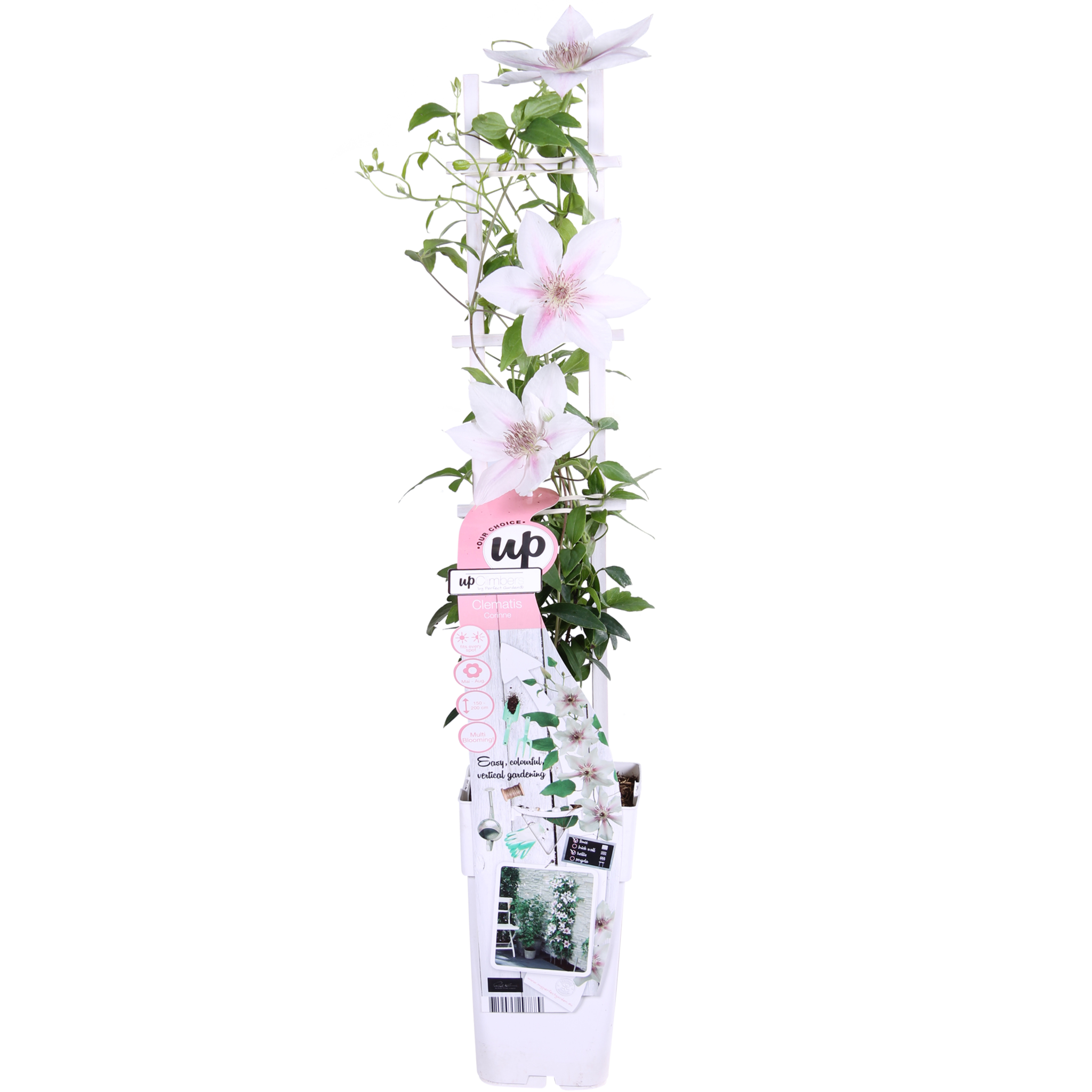 Bardzo wyjątkowy powojnik, który kwitnie przez całe lato. Od maja do września możesz cieszyć się jego dużymi, biało-różowymi, pasiastymi kwiatostanami. Już w pierwszym roku powojnik zapewnia oazę kwiatów. W przeciwieństwie do większości odmian powojników, które kwitną od 1 do 2 miesięcy, ‘Corinne’ możesz cieszyć się przez 5 miesięcy. Powojnik ‘Corinne’ osiąga maksymalnie 180 cm wysokości przy pergoli lub kratce. Ten powojnik najlepiej czuje się w miejscu w (pół)pełnym słońcu. Najbardziej idealne jest miejsce z porannym i/lub wieczornym słońcem. Ponieważ ‘Corinne’ jest odmianą kompaktową, można ją również posadzić w doniczce na balkonie, tarasie, a nawet w wiszącym koszu. Aby powojnik lepiej się wspinał, potrzebuje trochę pomocy. Najlepiej jest prowadzić roślinę wzdłuż kratki, drutu lub tyczki. Przycinanie nie jest konieczne. Usuń jednak martwe i uszkodzone pędy na początku marca. Wiosną możesz przyciąć ten powojnik do maksymalnie 20 centymetrów nad ziemią.