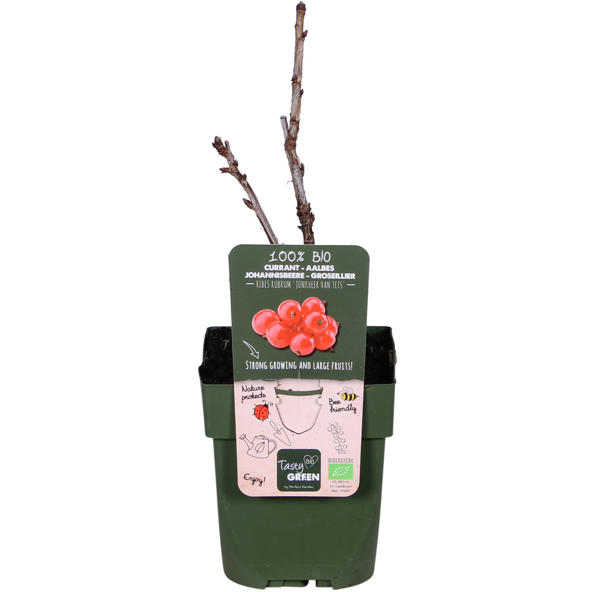 Tasty Green, owoce pochodzące w 100% z upraw ekologicznych. Oznacza to, że podczas uprawy wykorzystywano wyłącznie materiały pochodzenia roślinnego i zwierzęcego. Doniczka i etykieta są wykonane z tworzywa sztucznego pochodzącego z recyklingu, dzięki czemu stanowią rozwiązanie przyjazne dla środowiska. „Ribes Rubrum Jonkheer van Tets” to czerwona porzeczka. Krzew rośnie bujnie i ma wysoką wydajność owocową. Jest to jedna z najwcześniej dojrzewających czerwonych porzeczek, owoce są dojrzałe już pod koniec czerwca. Jagody rosną w długich gronach i mają kwaśny, ale świeży smak. Można je jeść na przykład w cieście lub jako dżem. Krzew kwitnie wiosną małymi zielono-białymi kwiatami.
