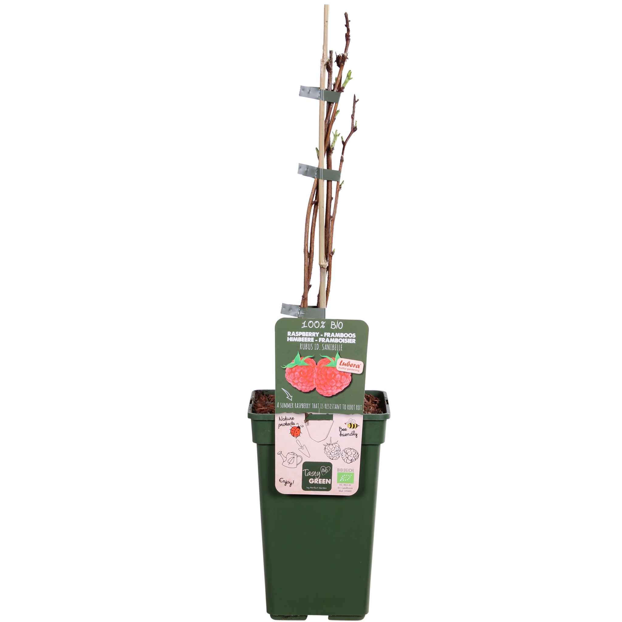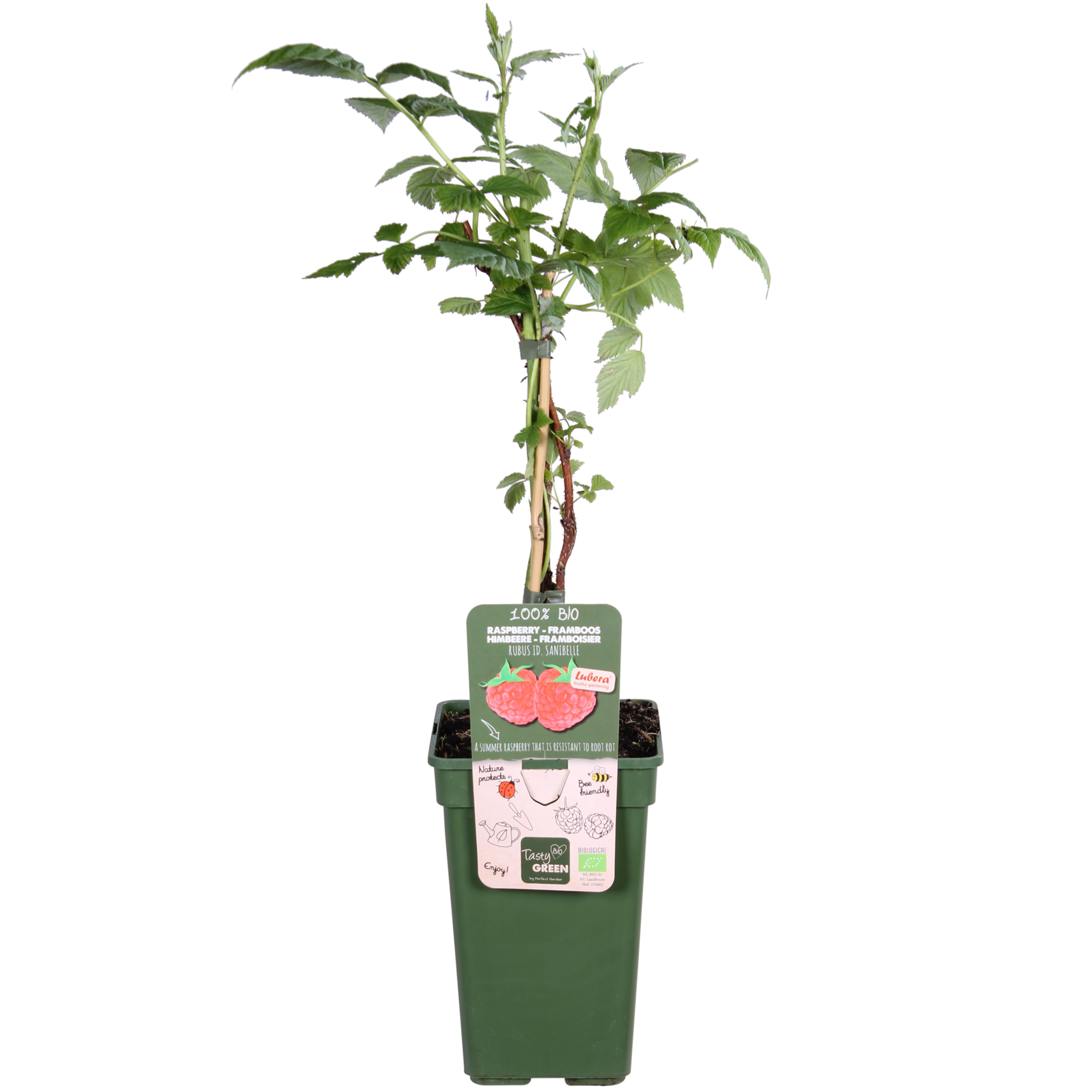 „Rubus Sanibelle” to silnie rosnąca malina letnia. Maliny są duże, pięknie ciemnoczerwone i pysznie słodkie. Ta malina jest samopylna i kwitnie w maju niepozornymi, małymi biało-różowymi kwiatami, które przyciągają pszczoły i trzmiele. Po kwitnieniu rozwijają się maliny. Można je jeść prosto z krzaka, ale z malin można też zrobić pyszną konfiturę i sok. Maliny są często bardzo drogie w sklepach, dlatego o wiele przyjemniej jest uprawiać je samemu! W przypadku malin w pierwszym roku tworzy się tylko pęd, a w następnym roku pojawiają się na nim owoce. Dlatego po zbiorach pędy, które owocowały, można od razu przyciąć krótko przy ziemi. Młode pędy zakwitną w następnym roku i wydadzą owoce. Jesienią ta malina traci liście. Malina potrzebuje wsparcia, aby dobrze rosnąć, dlatego zawsze umieszczaj ją przy kratce. Ponadto lubi słoneczne miejsce.
