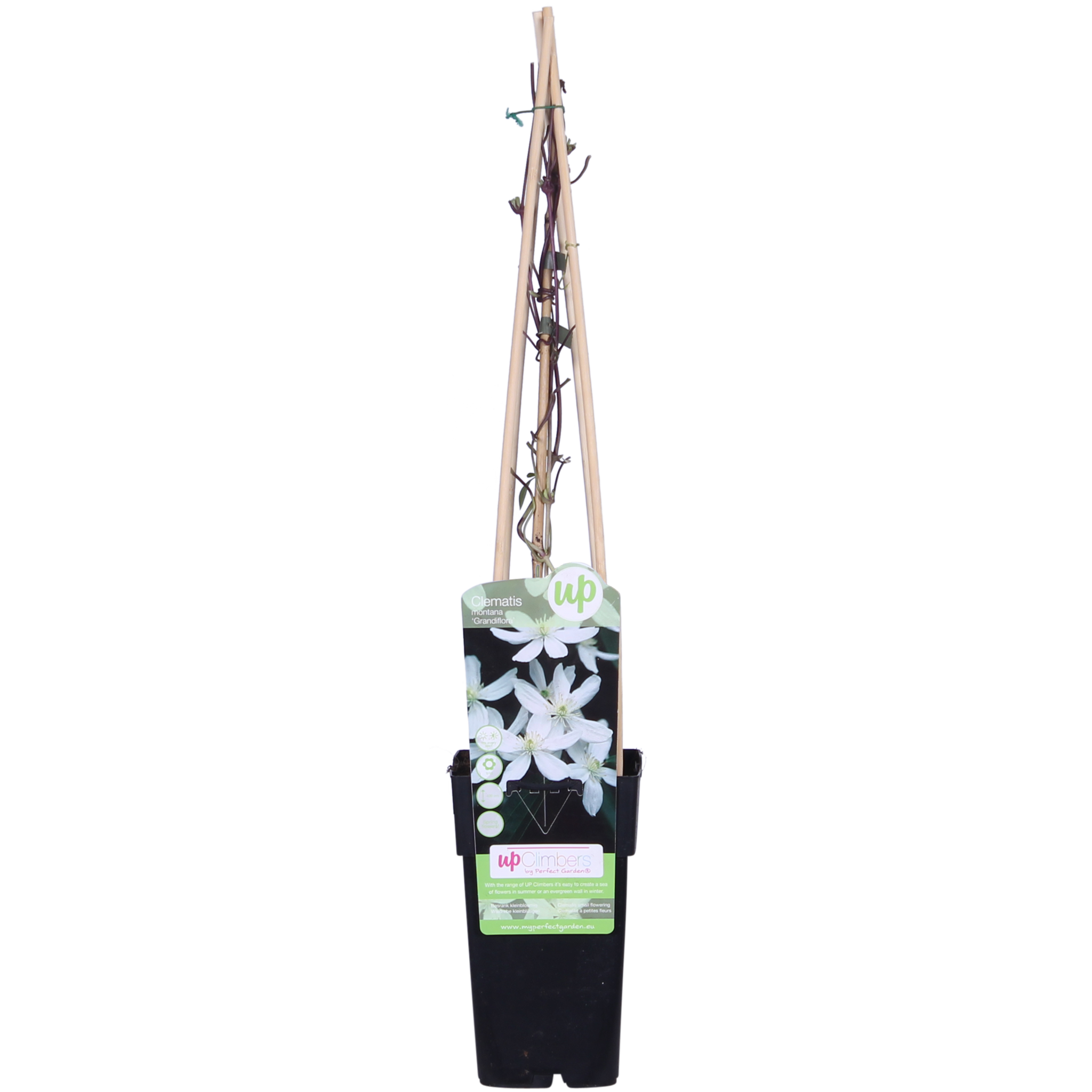 Clematis Montana Grandiflora to niewielka, ale obficie kwitnąca powojnik, która wiosną pokrywa się mnóstwem białych, pachnących kwiatów. Powojnik rośnie szybko i tworzy więcej i dłuższych pędów niż większość powojników. Roślina ta idealnie nadaje się do porastania pergoli, ale świetnie sprawdzi się również wzdłuż ściany, ogrodzenia lub kratki. Potrzebuje jednak pomocy przy pnąciu, ponieważ nie przyczepia się do podłoża. Można ją więc poprowadzić po drucie lub siatce. Cechą charakterystyczną tej odmiany jest to, że jej liście zmieniają kolor jesienią. Niskie temperatury nie stanowią problemu dla tej odpornej na zimę rośliny pnącej.