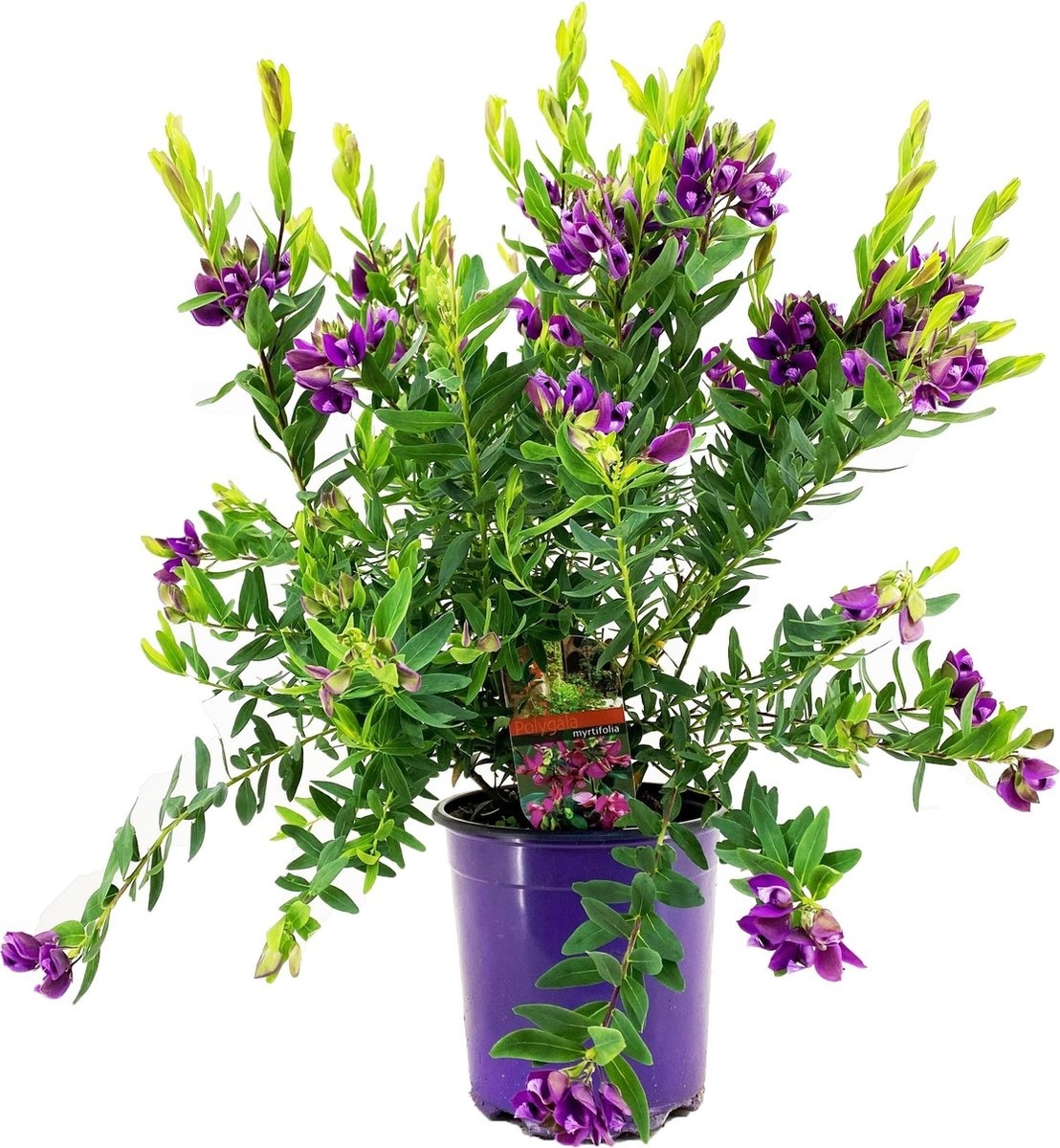 Polygala myrtifolia jest również nazywana kwiatem skrzydełkowym. Roślina kwitnie od kwietnia do października. Polygala ma piękne, wesołe fioletowe kwiaty. W ciemności kwiaty zamykają się, a gdy robi się jasno, ponownie się otwierają. Liście są owalne i zielone. Roślina jest zimozielona.