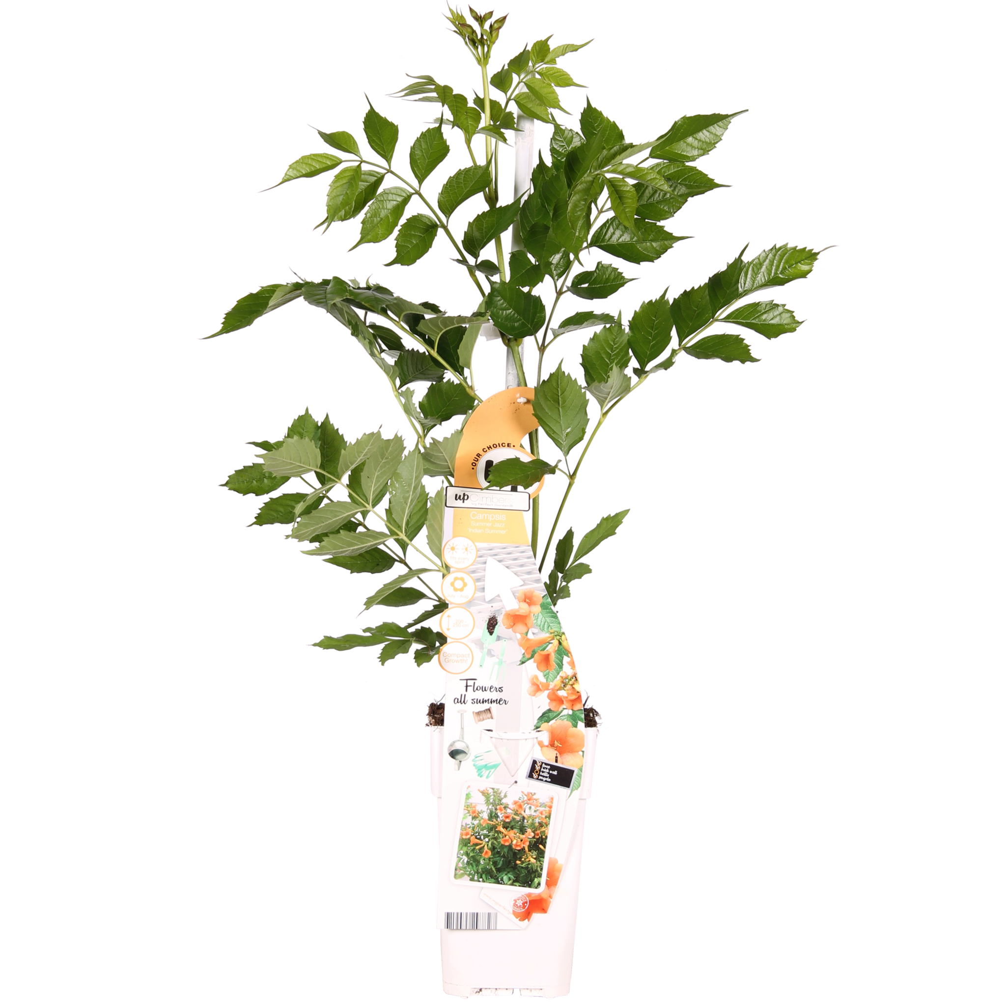 ‘Campsis Indian Summer’ ma piękne pomarańczowe kwiaty w kształcie trąbek, które natychmiast nadają Twojemu ogrodowi śródziemnomorski klimat. Pierwotnie campsis pochodzi z Ameryki, ale tę roślinę pnącą często spotyka się również we Włoszech, Hiszpanii, Grecji i Chorwacji. Duża szansa, że kiedyś spotkałeś ją na wakacjach. Na szczęście campsis jest wystarczająco mrozoodporny, więc możesz łatwo przenieść wakacyjny nastrój do własnego ogrodu. Umieść roślinę w słonecznym i nieco osłoniętym miejscu. Przy dużej ilości słońca ten trąbkowiec będzie kwitł obficiej i dłużej. Campsis kwitnie stosunkowo późno latem. Jest to moment, kiedy wiele roślin już przekwitło, dlatego campsis jest pięknym uzupełnieniem ogrodu. ‘Campsis Indian Summer’ rośnie nieco bardziej kompaktowo niż inne odmiany. Możesz go przycinać do pożądanego kształtu wczesną wiosną. Nie obawiaj się mocno przycinać campsis, gdy stanie się zbyt duży i dziki. Jest to silna i szybko rosnąca roślina, która nie odczuje z tego powodu większych szkód. Campsis należy do grupy pnączy samoczepnych. Oznacza to, że wspinają się po ścianie lub ogrodzeniu za pomocą korzeni czepnych, które tworzą się z gałęzi. Dokładnie tak, jak robią to bluszcz i hortensja pnąca. Na początku możesz pomóc campsis, ale potem mogą wspinać się samodzielnie.