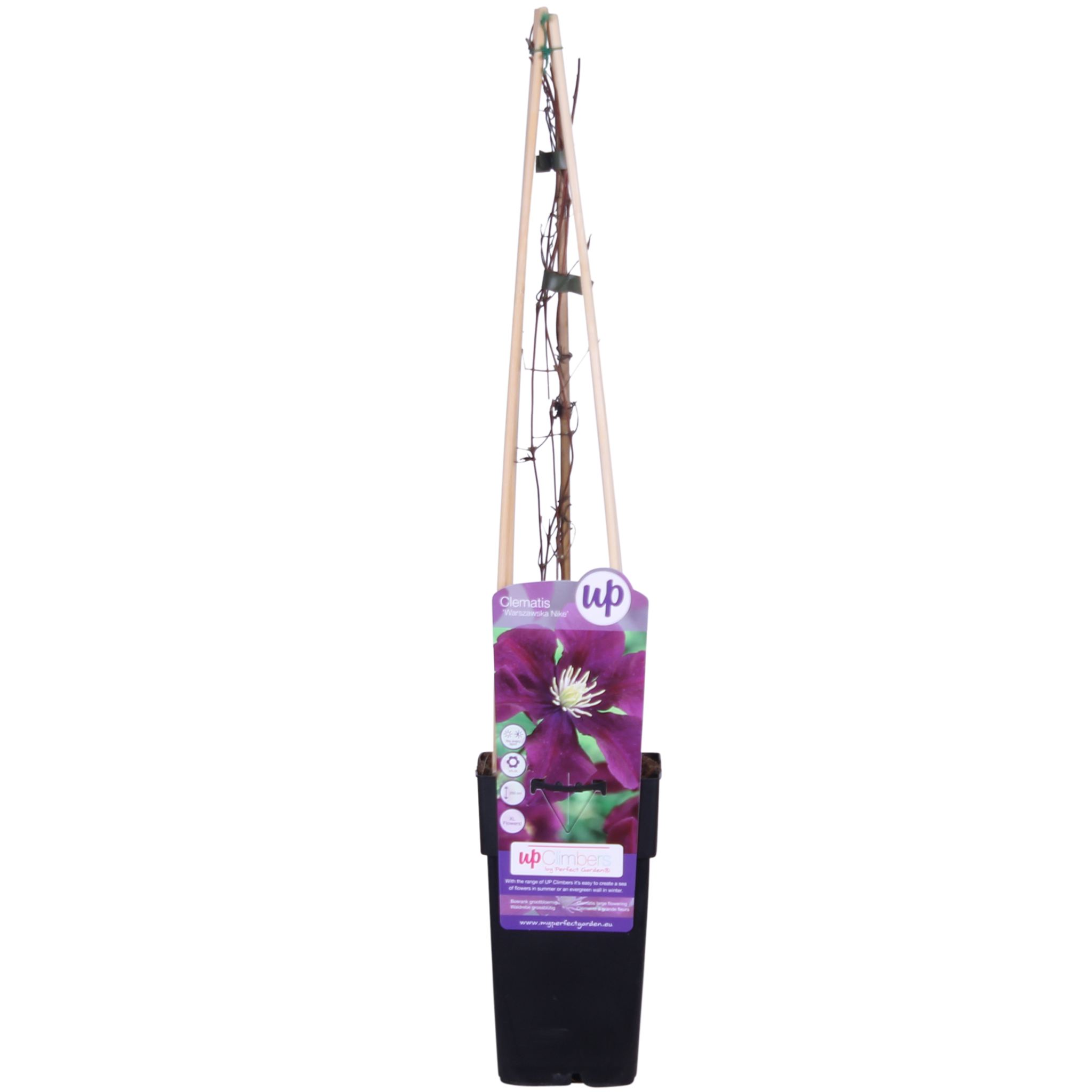 Powojnik wielkokwiatowy; Powojnik Warszawska Nike, dzięki swoim dużym, ciemnoczerwonym kwiatom, przyciąga wzrok w Państwa ogrodzie i jest prezydentem wśród powojników. Ta silna odmiana kwitnie dwa razy w roku. Po pierwszym kwitnieniu najlepiej przyciąć roślinę, aby zakwitła po raz drugi. Dzięki zgrabnemu i zwartemu wzrostowi ta pnączka nadaje się zarówno do dużych, jak i małych ogrodów. Rośnie około 1,5 metra rocznie i w razie potrzeby można ją co roku przycinać do maksymalnie 25 cm nad ziemią. Aby Państwa powojnik lepiej i ładniej się piął, potrzebuje trochę pomocy. Najlepiej poprowadzić roślinę wzdłuż kratki, drutu lub palika.