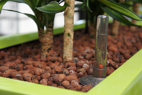 - Umieść wskaźnik poziomu wody na dnie doniczki i wypełnij dolną część wulkanicznym substratem (vulkastrat) lub hydrogranulatem (hydrokorrels) (aż do całkowitego zakrycia otworów na dnie wskaźnika poziomu wody)